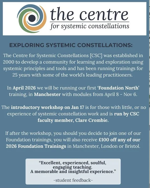I will be in Manchester on January 17th, to offer an Introductory workshop for anyone who would like to know more about constellations, and have an experience - which is the best way to understand “how does this stuff work????…” to find out more contact Hannah at CSC